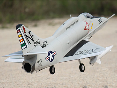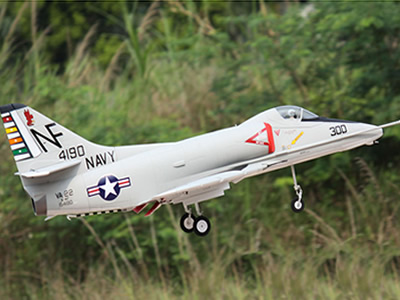 We recommend the Freewing 80mm A-4E/F Skyhawk for Intermediate pilots and above with prior experience on other Freewing 80mm EDF jets, operating on paved or short cut grass runways. Flying with full ordnance and the avionics hump gives pilots a different experience than flying fully clean, so we encourage pilots to try all configurations and see what best suits their flying style. We prefer flying without the draggy fuel tanks, but with the Bullpup missiles, both for "cool" factor and for orientation. In the air, the Freewing A-4 is a balance between the Freewing F-86 and the Freewing Mirage-easy to fly yet quick to disappear! The A-4's wing has been optimized for balanced handling and a mild stall. Like a typical delta wing, the A-4 bleeds speed in turns, and has a very fast and axial roll rate. Flaps are not needed for smooth rotation takeoffs or slow landings. See the manual for flap-to-elevator mixing to bring in your Skyhawk slow and slightly nose high for perfect landings every time! Having been developed over several years, we endeavored to create an accessible A-4 that looks the part yet is user-friendly. We think you'll be very pleased with the result!